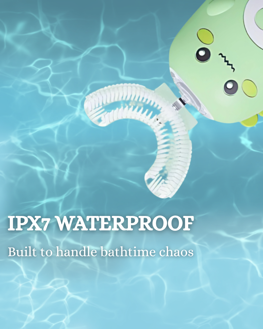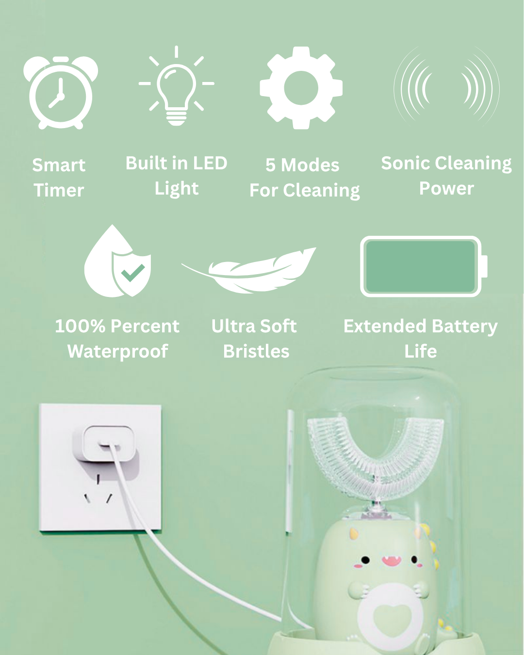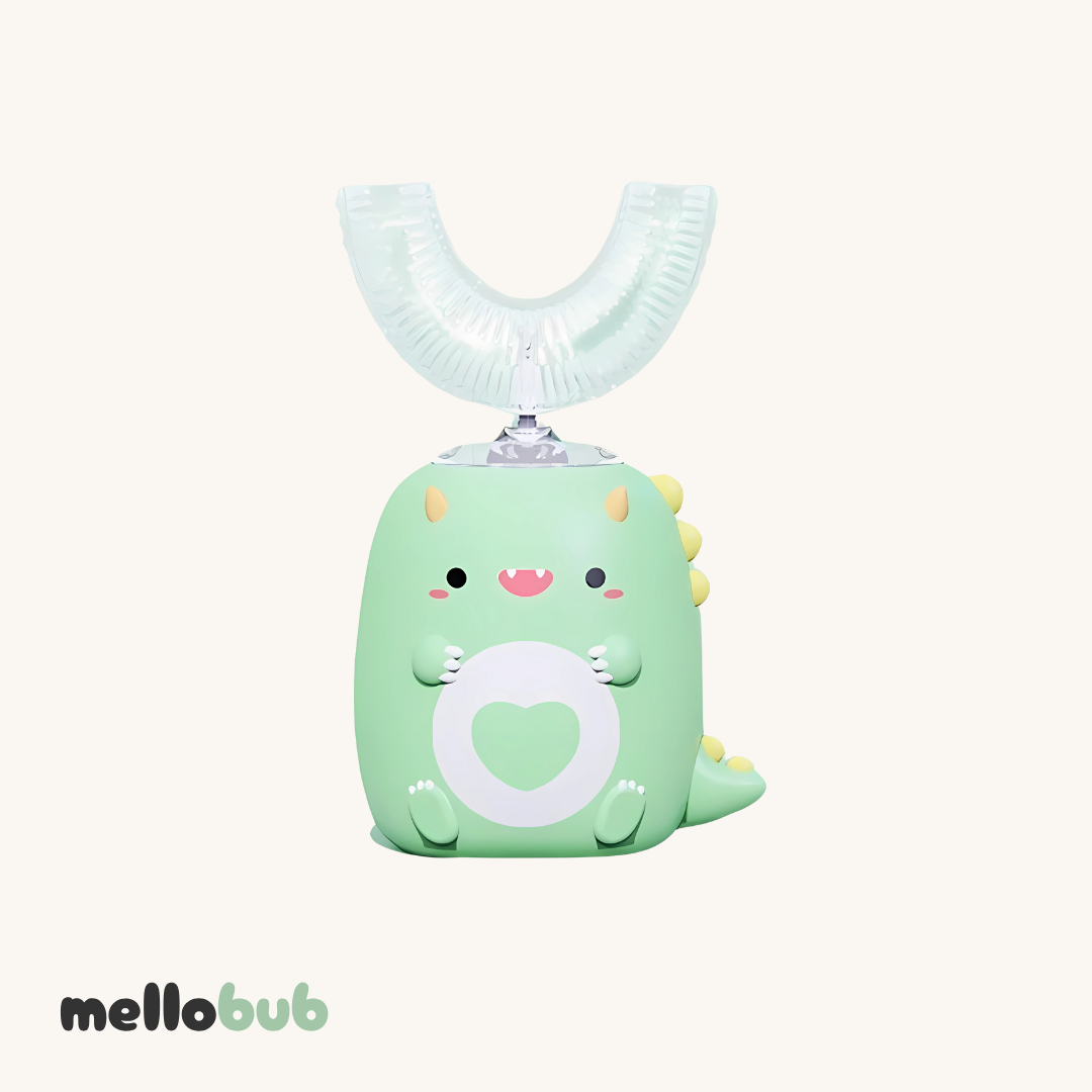 Our U-shaped toothbrush is made just for kids and cleans all teeth at once—like magic! Add toothpaste, pop it in, press a button. Soft, food-grade silicone bristles gently scrub every tooth while your child moves it side to side. It’s quick, gentle, and actually fun.
