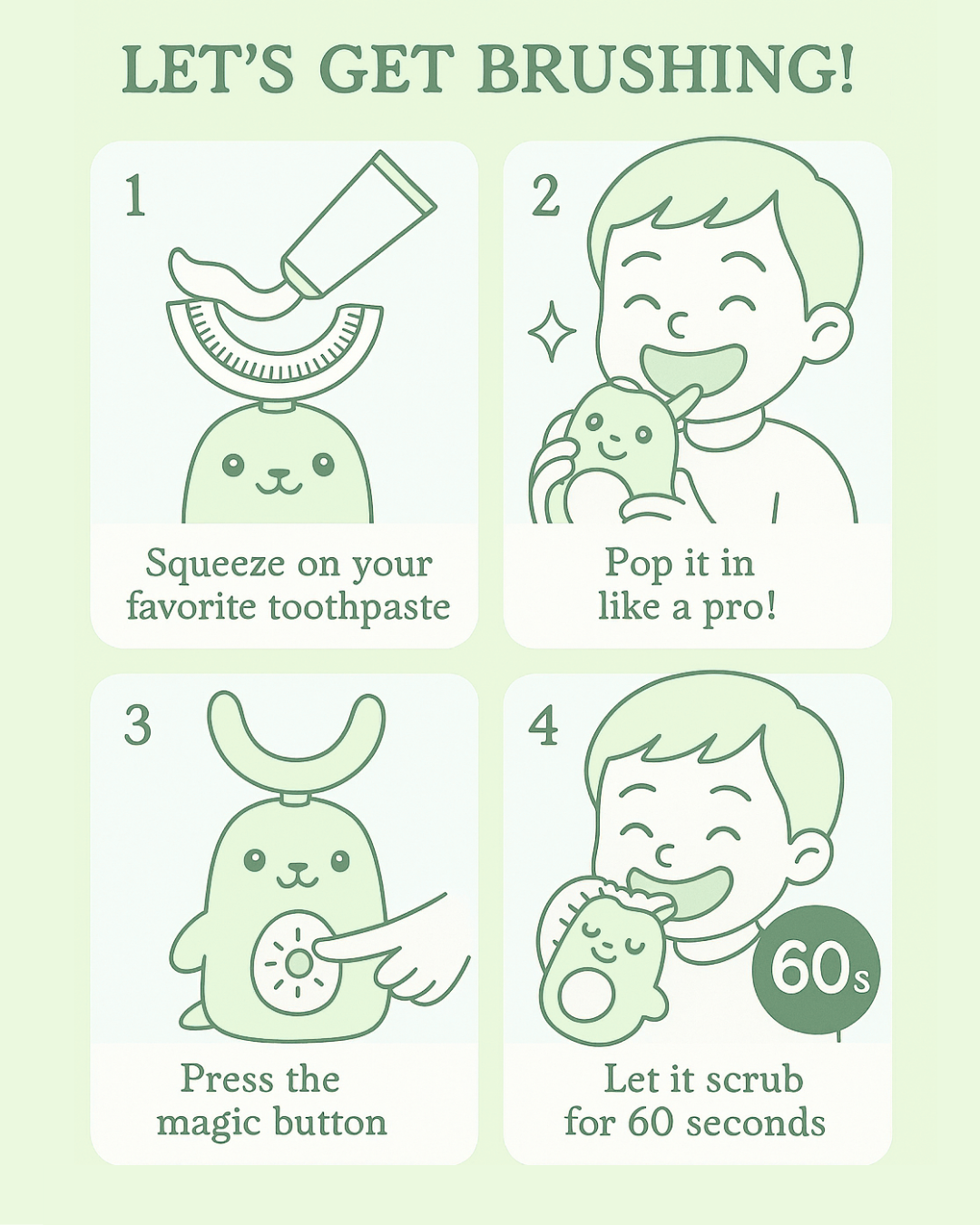 No more fuss, no more mess—just happy smiles and cleaner teeth in 60 seconds.